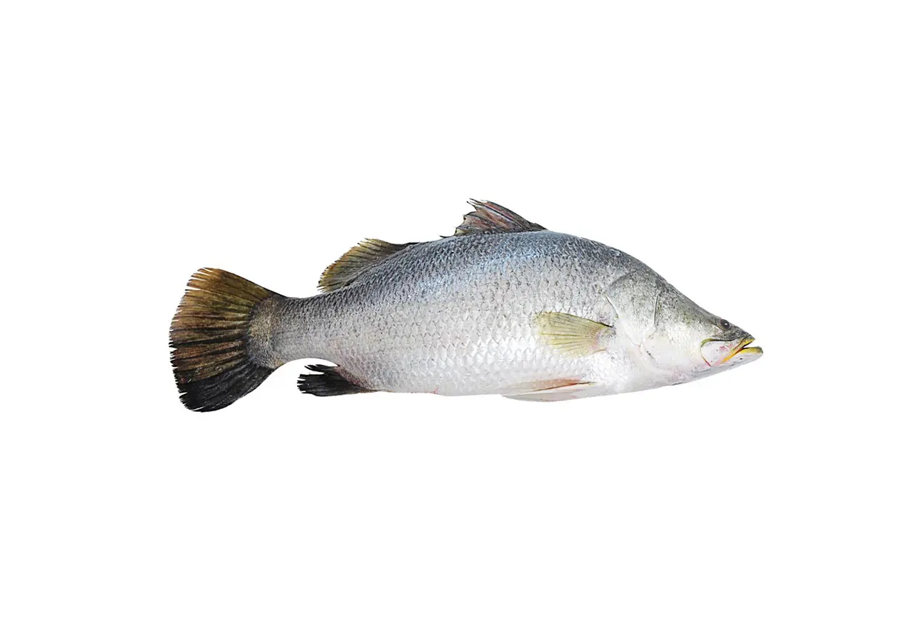 Barramundi, also known as Asian seabass, is a species of fish found in brackish and coastal waters of tropical regions. They have an elongated body, shiny scales, and are usually blue-gray or greenish in color.